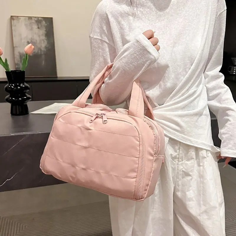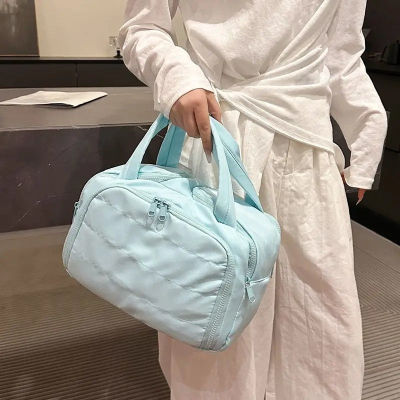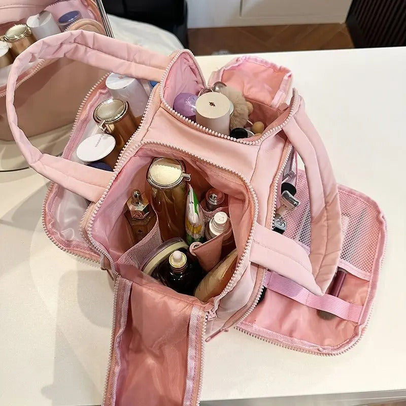 בשונה מתיקים שנמעכים ומתבלגנים, תיק הרחצה שלנו שומר על צורה יציבה ורכה שמגנה על כל המוצרים שלך גם בזמן נסיעה. עם 4 תאים חכמים, חומר עמיד למים ורוכסנים איכותיים – הוא מספק קיבולת גדולה בעיצוב אלגנטי שנראה כמו אקססורי, לא רק תיק.