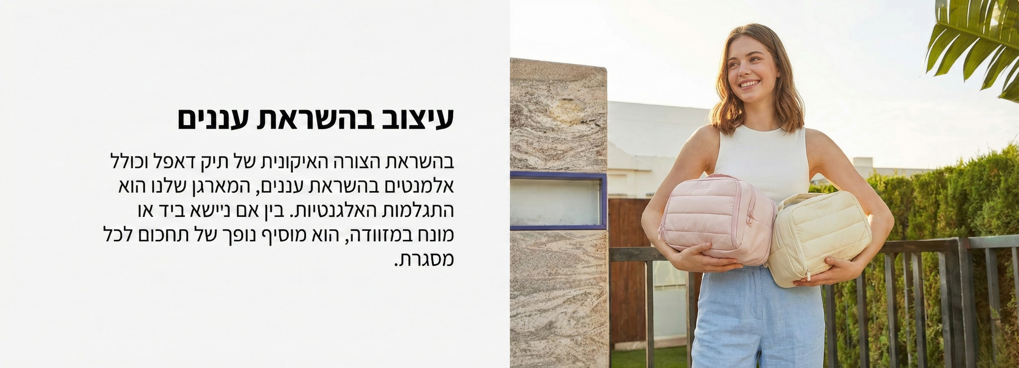 - ניקוי קל ויומיומי: ניתן פשוט לנגב את התיק בעזרת מטלית לחה כדי להסיר כתמים קלים או שאריות. התיק מצויד בבטנה עמידה למים, מה שהופך את הניקוי של נוזלים או תכשירים שנשפכו בתוכו לפשוט ומהיר מאוד.