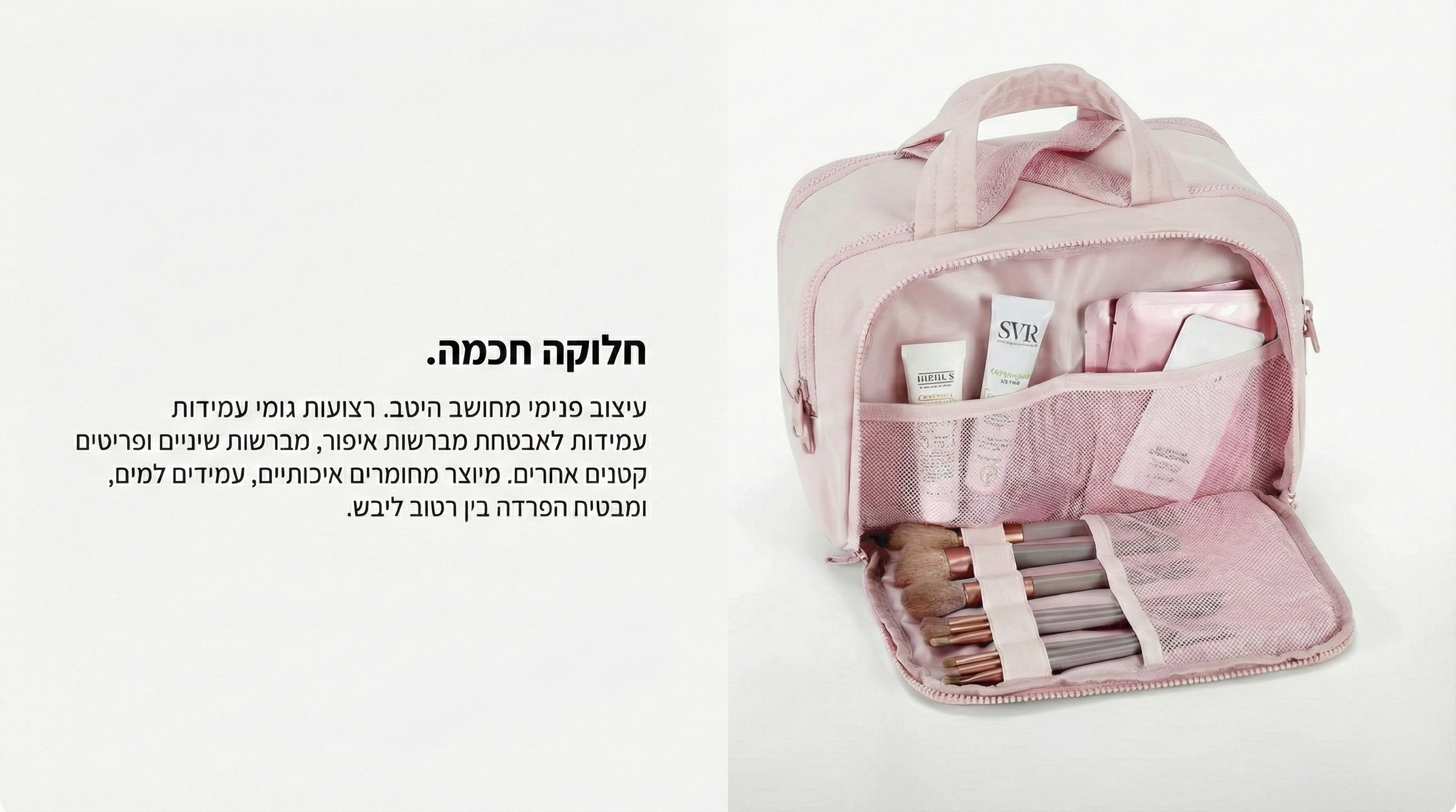 - הפרדה חכמה: כיס אחורי לפריטים רטובים, ותאים מיועדים לפריטים יבשים.